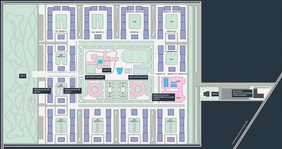 На территории будут школа на 1300 мест и два детских сада на 300 мест каждый,